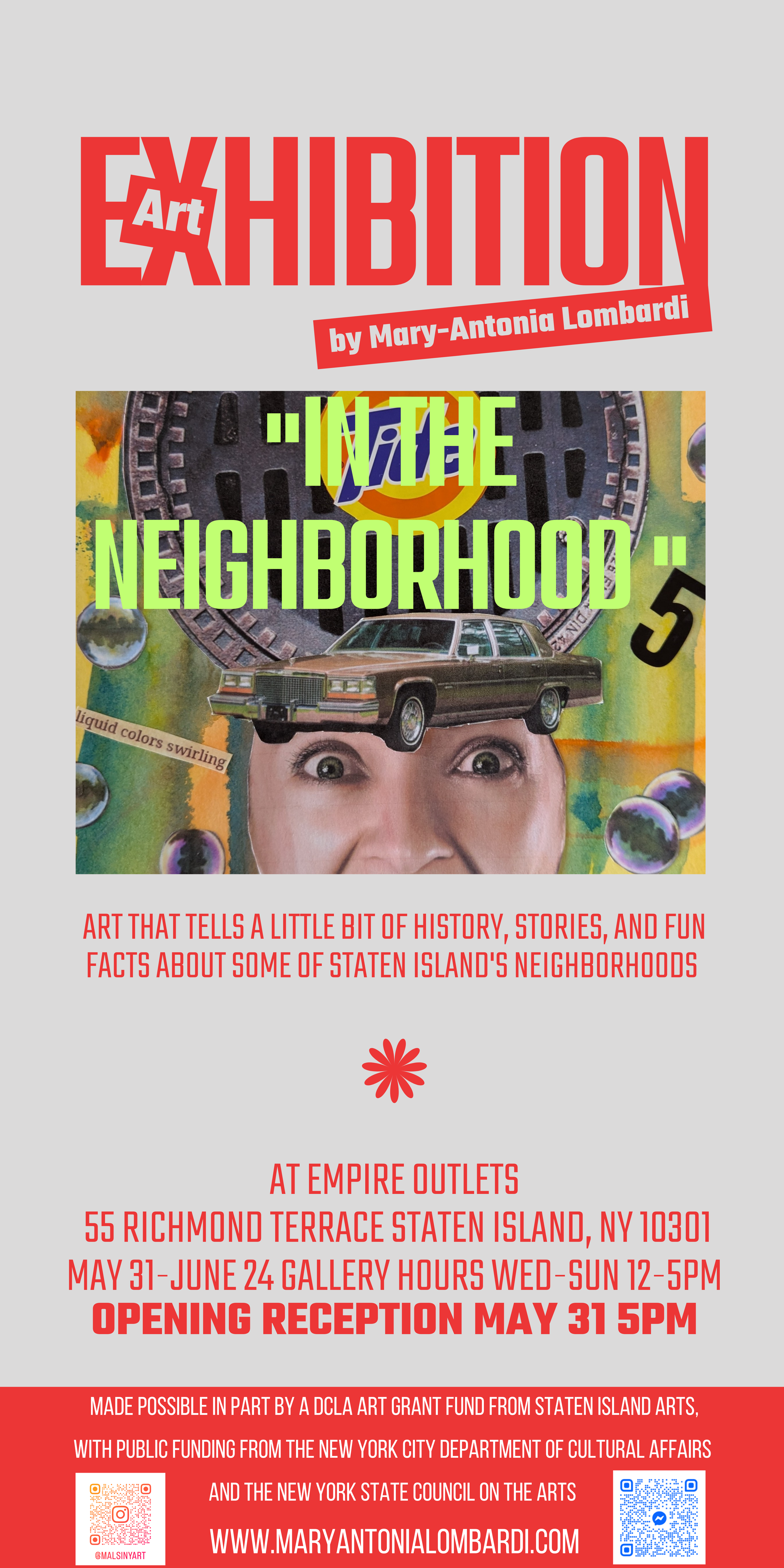 I am thrilled to announce that I will be having a solo exhibit starting on May 31st. This is an extension of my book “Welcome to The Neighborhood, 10302.” I was awarded a grant from Staten Island Arts and have rented a space in Empire Outlets, located here on Staten Island, to showcase this project. The exhibit will feature art pieces in various media that tell a bit of history, stories, and/or fun facts about some of Staten Island’s neighborhoods.